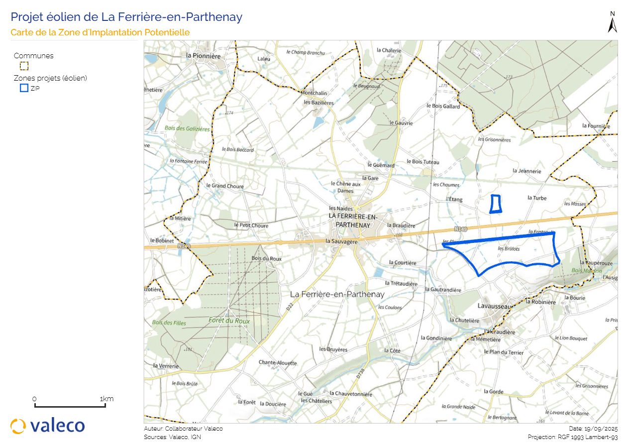 La zone d’étude du projet éolien de La Ferrière-en-Parthenay se situe sur la commune de La Ferrière-en-Parthenay. Elle respecte les contraintes réglementaires telles que l’éloignement aux habitations (500 m), aux routes, etc. Des premières consultations ont été réalisées afin de vérifier qu’aucune servitude n’impacterait le projet : radar, couloir aérien, faisceau de gendarmerie, faisceaux hertziens et internet, lignes hautes tensions, etc.