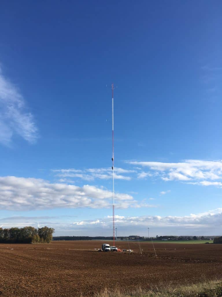 D’une hauteur souvent comprise entre 100 et 150m, le mât de mesure permet de mesurer les vitesses et directions de vent afin d’affiner le gisement d’un site et ainsi de définir précisément le productible des futures éoliennes.