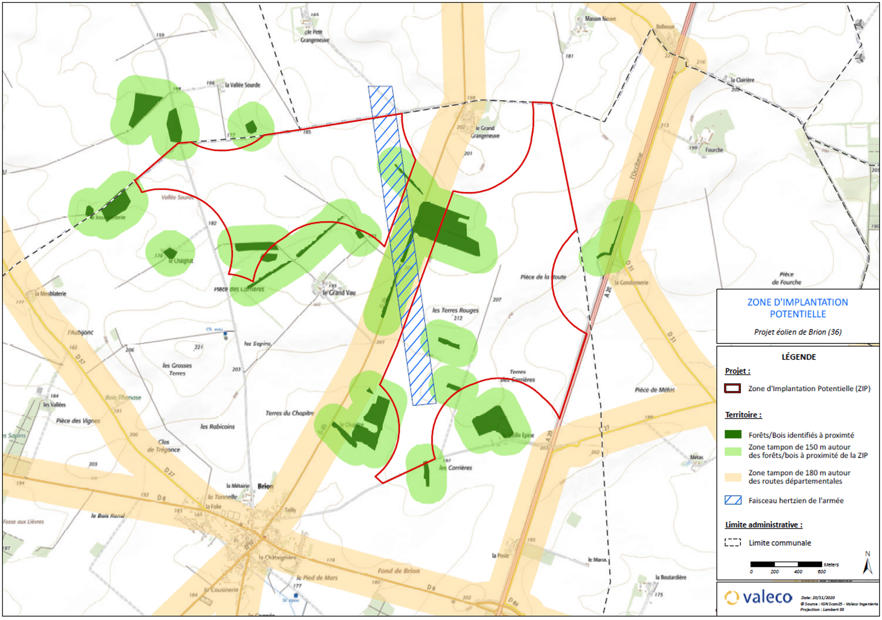 Le développement d’un projet éolien se fait en plusieurs étapes. La première étape est le choix d’une zone pouvant potentiellement accueillir un projet. En effet, différentes contraintes empêchent l’implantation d’un parc éolien sur le territoire telles que les radars de l’Armée ou encore la distance réglementaire de 500m aux habitations par exemple. Une étude de préfaisabilité conduite par Valeco en 2019 a permis d’identifier plusieurs zones d’implantation potentielles, à cheval entre les communes de Brion et de Bretagne, situées au sein de la Communauté de communes de Levroux.