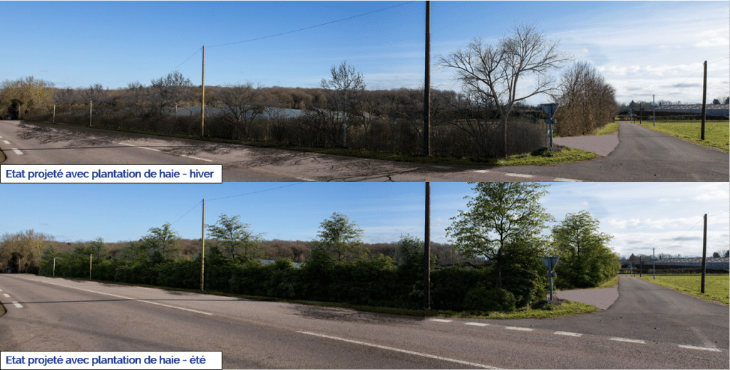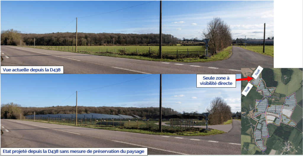 D’un point de vue paysager, le projet a très peu de visibilité depuis les villages et les alentours. La seule zone de visibilité directe est depuis la route départementale D438, où il est prévu d’implanter des haies qui, au bout d’environ 4/5 ans, masqueront totalement les panneaux
