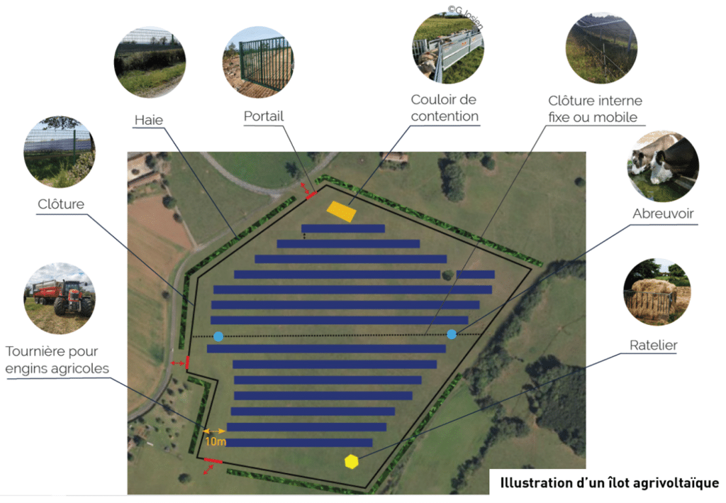 Ci-contre, un exemple d’îlot agrivoltaïque défini en concertation avec l’agriculteur et le bureau d’études expert agricole.