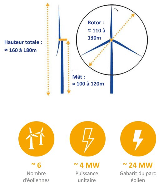 Nouvelle présentation sur la base d’un projet commun aux 3 communes, avec un gabarit d’environ 6 éoliennes de 4MW de puissance unitaire implantées sur les forêts communales (données à titre indicatif, susceptible d’évoluer à mesure des études et de la concertation autour du projet).