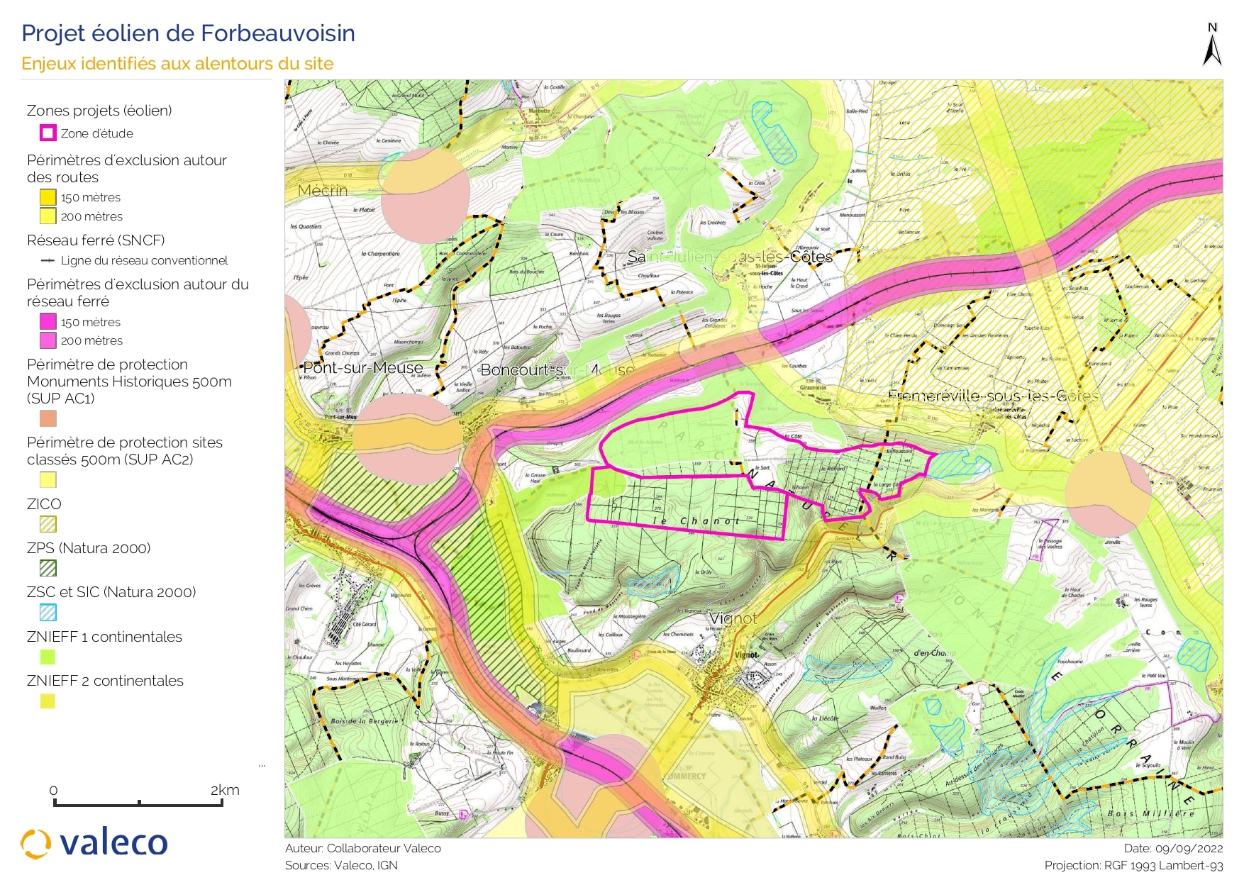 La zone d’étude du projet éolien de Forbeauvoisin (nom d’un lieu-dit et ancien bourg du secteur, choisi à l’unanimité par la commission) se situe sur les forêts communales au sud-est de Boncourt-sur-Meuse, au sud de Girauvoisin, au sud-ouest de Frémeréville-sous-les-Côtes et au nord de Vignot. Elle respecte des contraintes réglementaires telles que l’éloignement aux habitations (500m), aux routes, etc. Des premières consultations ont été réalisées afin de vérifier qu’aucune servitude n’impacterait le projet : radar, couloir aérien, faisceau de gendarmerie, faisceaux hertziens et internet, lignes hautes tensions, etc.