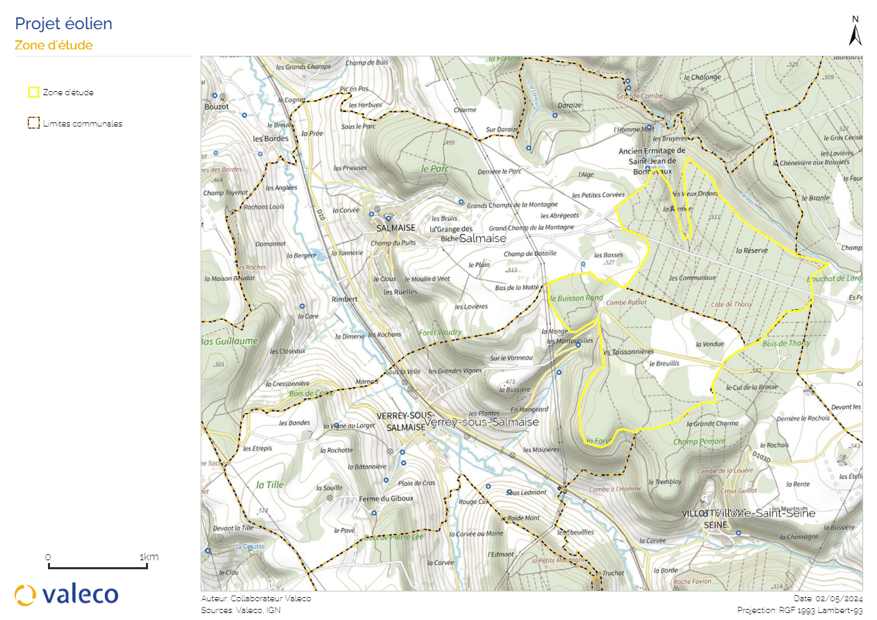 La zone d’étude du projet éolien se situe sur les communes de Salmaise et de Verrey-sous-Salmaise. Elle respecte les contraintes réglementaires telles que l’éloignement aux habitations (500m), aux routes, etc. Des premières consultations ont été réalisées afin de vérifier qu’aucune servitude n’impacterait le projet : radar, couloir aérien, faisceau de gendarmerie, faisceaux hertziens et internet, lignes hautes tensions, etc.